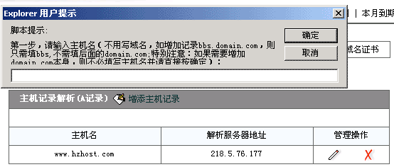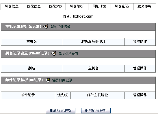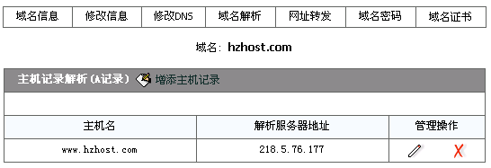 通常一个域名要访问到某个网站需要两个条件,一个是把该域名解析到放置该网站的主机IP上;另一个则是在虚拟主机上绑定该域名。 现以域名hzhost.com为例,把域名www.hzhost.com以及hzhost.com解析到虚拟主机上(假设虚拟主机的IP地址为218.5.76.177),解析完成后,您将可以用www.hzhost.com以及hzhost.com来访问您的网站,当然(解析完成后,还得在虚拟主机上绑定才会生效,本站的虚拟主机完全具备域名自主绑定功能)。 1>首先请进入域名管理。(登录会员->英文域名管理->在列表中找到hzhost.com并点击"域名解析"),对于新申请的域名,您将看到以下图例: ![]() 2>我们首先来解析www.hzhost.com到IP:218.5.76.177。 点击"增添主机记录",然后在弹出的框内输入"www",注意,不能输入"www.hzhost.com"。如下图所示: ![]() 3>按"确定",然后输入IP地址:218.5.76.177,如下图所示: ![]() 4>再按"确定",该解析就完成了,该解析实时生效,大大方便了客户管理,如下图所示: ![]() 5>一般而言,用户除了用带www的网址www.hzhost.com来访问网站外,还喜欢用不带www的hzhost.com来访问,下面我们来把hzhost.com解析到IP:218.5.76.177,还是点击"增添主机记录",将出现下图所示,此时不必输入任何字符,直接点击"确定"。(不输入字符代表域名hzhost.com本身) ![]() 6>点击确定后又出现IP地址输入框,输入IP:218.5.76.177,然后按确定,如下图所示: ![]() 7>按确定后,该解析也完成了。将出现下图所示。 ![]() 这样,域名解析部分就结束了,如果您的虚拟主机是在本站购买的,那么,您只用在虚拟主机管理里绑定域名www.hzhost.com和hzhost.com,那么,您就可以马上通过www.hzhost.com或者hzhost.com进行访问了,如果您的虚拟主机不是在本站购买的,那么,请通知虚拟主机提供商进行绑定。 另外,如果您还使用了邮箱,那么您还要解析邮件交换记录。具体参见:如何作MX记录(邮件交换记录) |