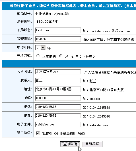 注意:如果您的會員號里有足夠的款,開通方式可以選擇"正式購買",這樣,郵局可以馬上開空,并且馬上投入使用。(前提是您的域名已經(jīng)正確解析到了該郵局IP