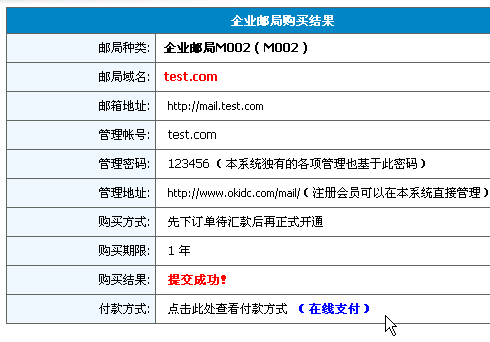 此時您將看到訂單提交的結(jié)果,如果您的帳戶上有足夠款項,并且您選擇的注冊方式是"正式購買",那么郵局將馬上開通成功并扣除購買款項,如果您選擇的開通方式是"只交訂單",那么空間并沒有真正開通,只是提交到了我們的申請訂單里,這時,您需要按"匯款方式"辦理匯款,并通知我們,我們將馬上為您辦理后續(xù)事宜。完全不用您自己操心。
