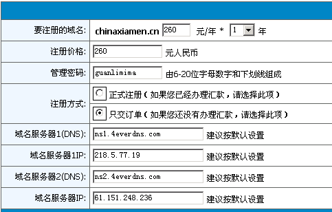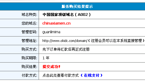 此時您將看到訂單提交的結果,如果您的帳戶上有足夠款項,并且您選擇的注冊方式是"正式注冊",那么域名將馬上注冊成功并扣除注冊款項,如果您選擇的注冊方式是"只交訂單",那么域名并沒有真正生效,只是提交到了我們的申請訂單里,這時,您需要按"匯款方式"辦理匯款,并通知我們,我們將馬上為您辦理后續事宜。完全不用您自己操心。