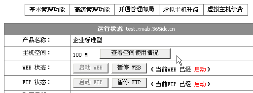 1> 進(jìn)入虛擬主機(jī)管理界面: 2> 在"基本管理功能"頁面,點(diǎn)擊"查看空間使用情況": 3> 現(xiàn)在您可以看到您的空間使用情況和郵局使用情況