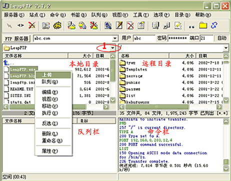 选择您要上传的文件,并点鼠标“右链”->“上传”, 这时在队列栏里会显示正在上传及未上传的文件, 当您的文件上传成功完成后,在命令栏里会出现“传送完成”的提示,此时在过程目录栏里就可以看到您上传的文件了。
